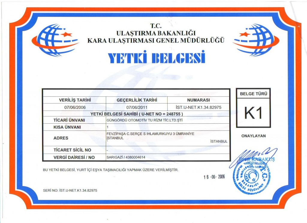 Eğer bir nakliyat firması, başkalarına ait olan eşyaları veya yükleri bir ücret karşılığında taşıyarak para kazanıyorsa, sahip olması gereken belge K1 Yetki Belgesi‘dir.